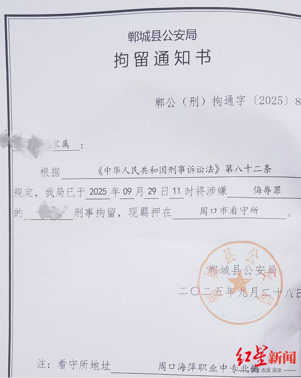 崔某甲告诉红星新闻记者,自己嫂子杨某在距离2017年争执发生8年多后,于今年9月29日,被郸城县公安局以涉嫌侮辱罪刑事拘留。红星新闻记者从郸城县公安局出具的拘留通知书上看到,杨某已被羁押在周口市看守所。此外,发生冲突时在场的崔某的表妹李某,也因涉嫌侮辱罪,在同一天(今年9月29日)被刑事拘留。